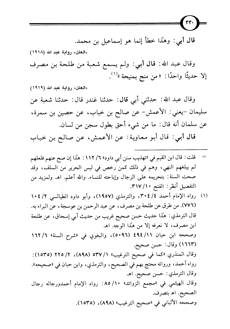 وقال عبد اللَّه: قال أبي: ولم يسمع شعبة من طلحة بن مصرف إلا حديثًا واحدًا: "من منح بمنيحة" (¬1).