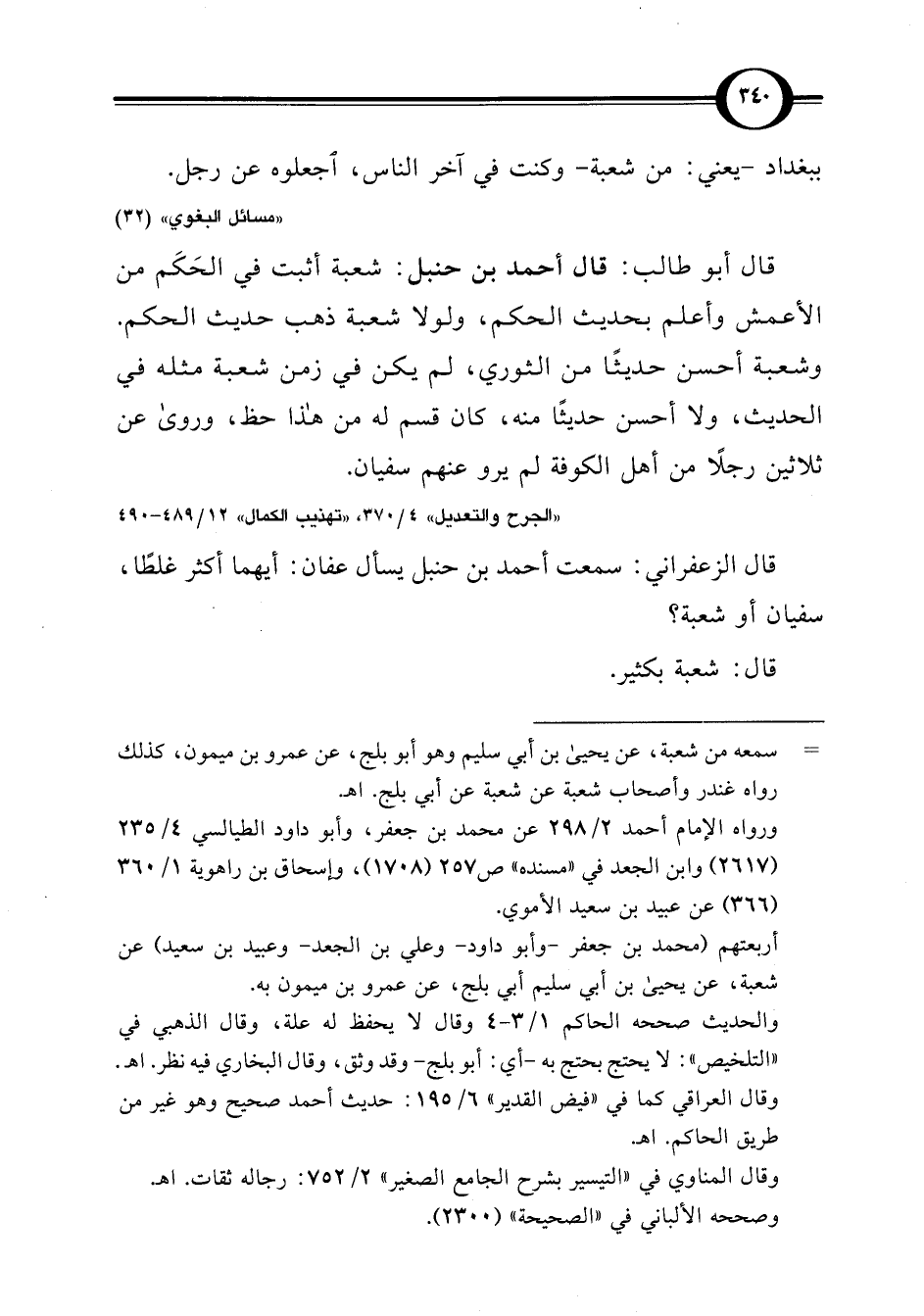 قال أبو طالب: قال أحمد بن حنبل: شعبة أثبت في الحَكَم من الأعمش وأعلم بحديث الحكم، ولولا شعبة ذهب حديث الحكم. وشعبة أحسن حديثًا من الثوري، لم يكن في زمن شعبة مثله في الحديث، ولا أحسن حديثًا منه، كان قسم له من هذا حظ، وروى عن ثلاثين رجلًا من أهل الكوفة لم يرو عنهم سفيان.