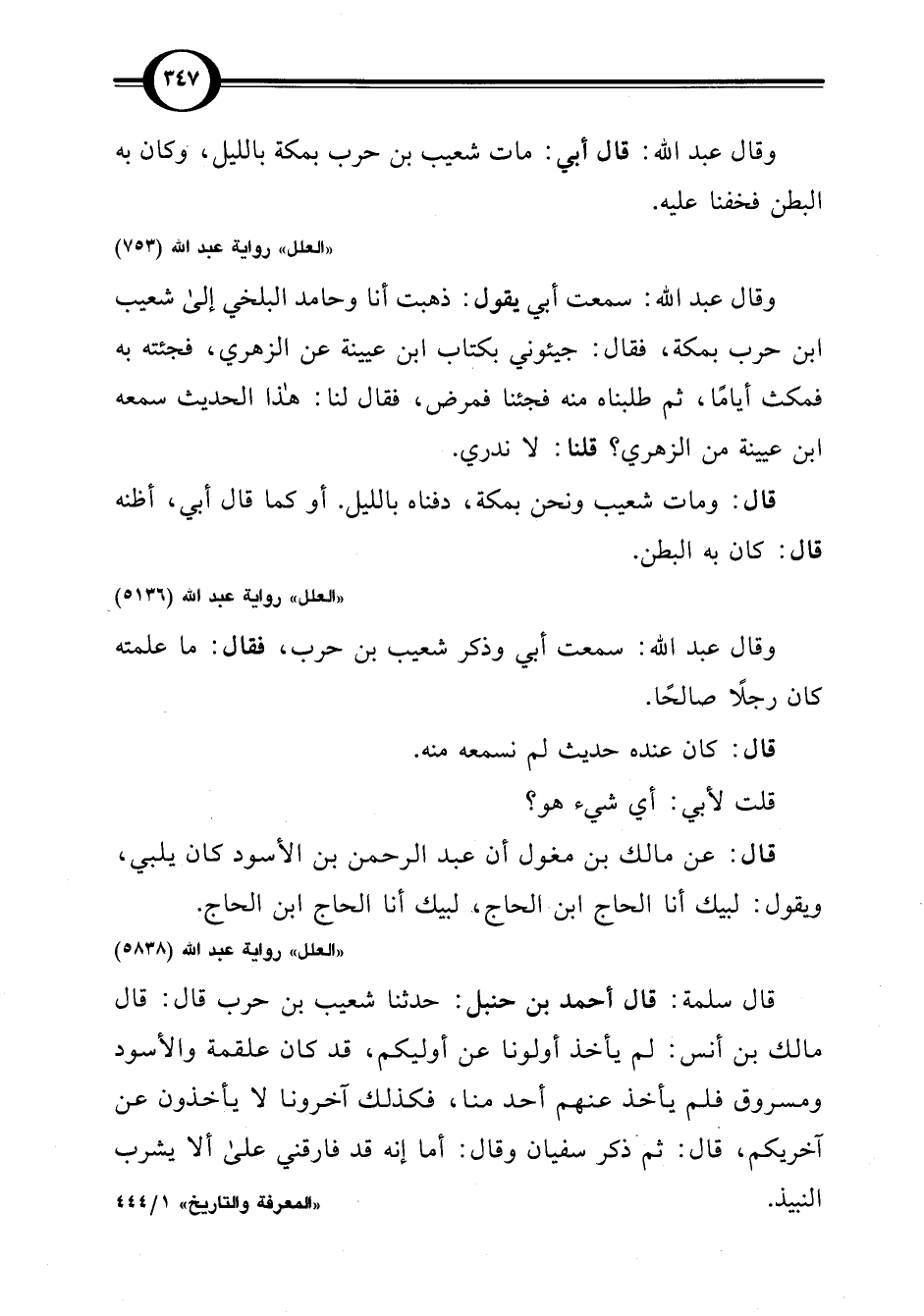 وقال عبد اللَّه: سمعت أبي يقول: ذهبت أنا وحامد البلخي إلى شعيب ابن حرب بمكة، فقال: جيئوني بكتاب ابن عيينة عن الزهري، فجئته به فمكث أيامًا، ثم طلبناه منه فجئنا فمرض، فقال لنا: هذا الحديث سمعه ابن عيينة من الزهري؟ قلنا: لا ندري.