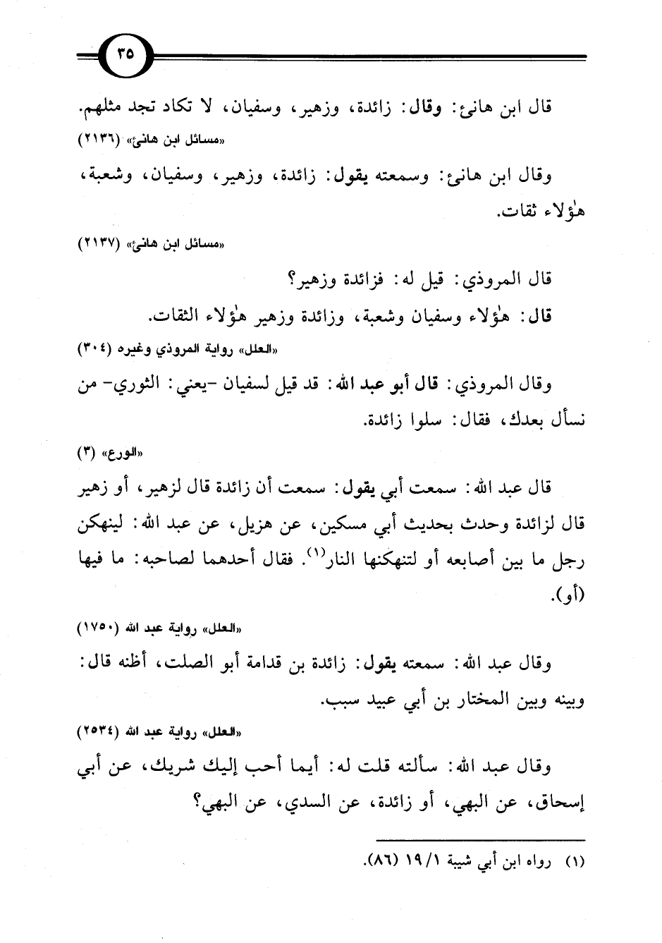 وقال المروذي: قال أبو عبد اللَّه: قد قيل لسفيان -يعني: الثوري- من نسأل بعدك، فقال: سلوا زائدة.
