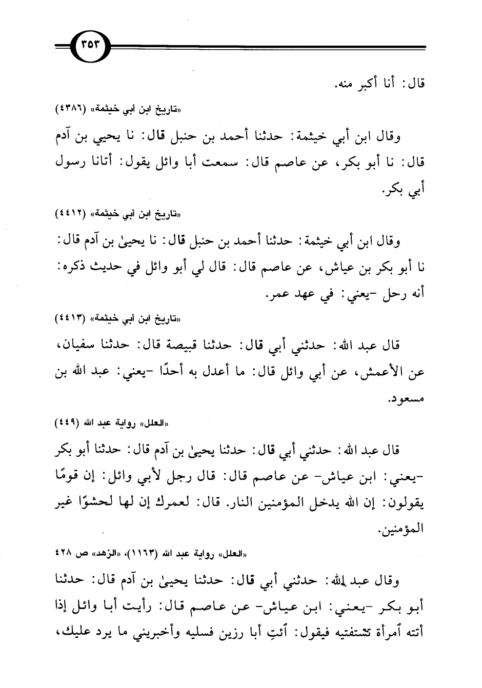 وقال ابن أبي خيثمة: حدثنا أحمد بن حنبل قال: نا يحيي بن آدم قال: نا أبو بكر، عن عاصم قال: سمعت أبا وائل يقول: أتانا رسول أبي بكر.
