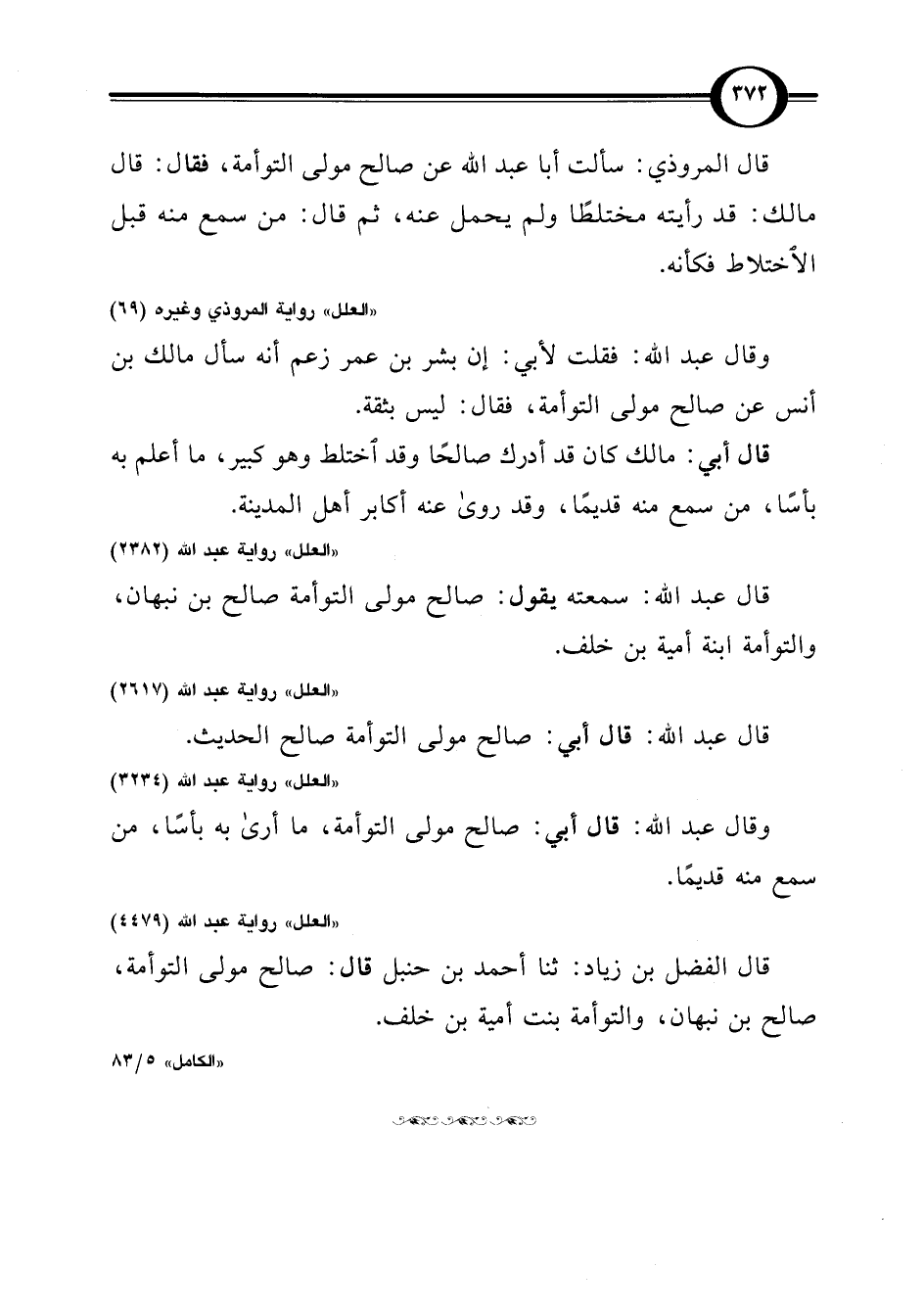 وقال عبد اللَّه: قال أبي: صالح مولى التوأمة، ما أرى به بأسًا، من سمع منه قديمًا.