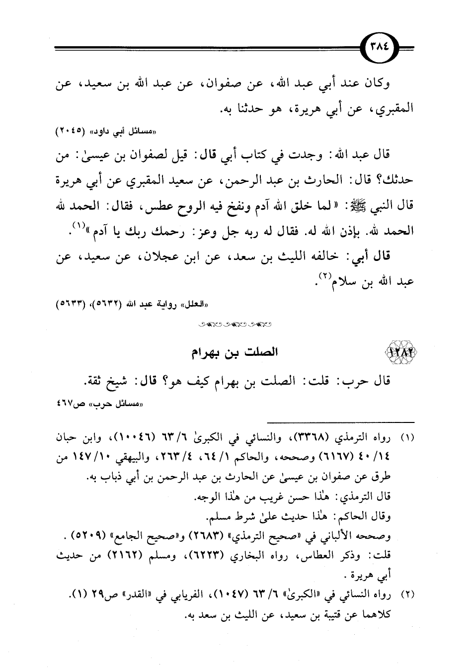 قال عبد اللَّه: وجدت في كتاب أبي قال: قيل لصفوان بن عيسى: من حدثك؟ قال: الحارث بن عبد الرحمن، عن سعيد المقبري عن أبي هريرة قال النبي -صلى اللَّه عليه وسلم-: "لما خلق اللَّه آدم ونفخ فيه الروح عطس، فقال: الحمد للَّه الحمد للَّه. بإذن اللَّه له. فقال له ربه جل وعز: رحمك ربك يا آدم" (¬1).