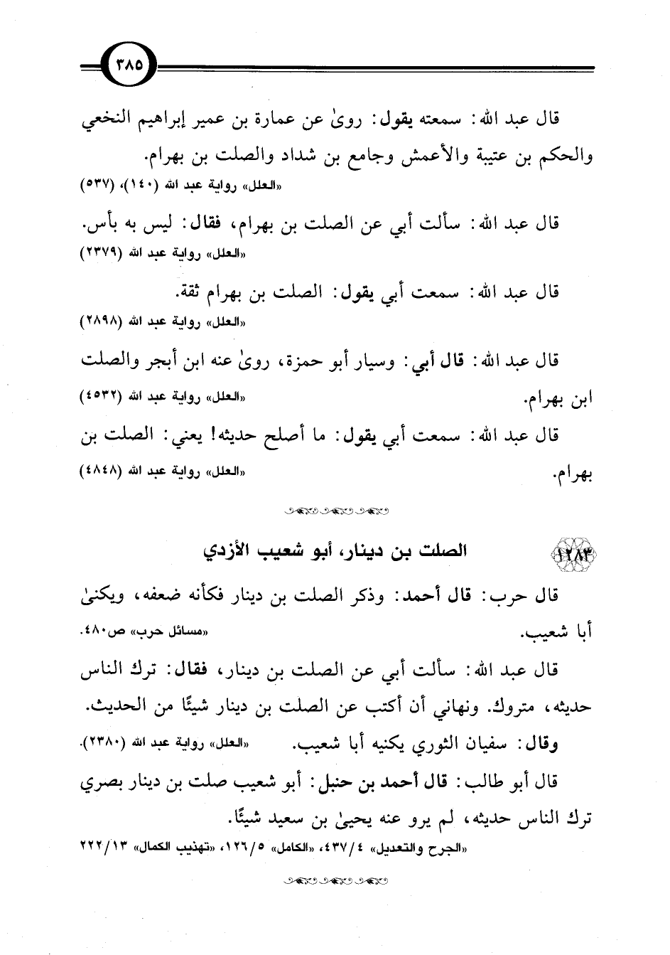قال حرب: قال أحمد: وذكر الصلت بن دينار فكأنه ضعفه، ويكنى أبا شعيب.