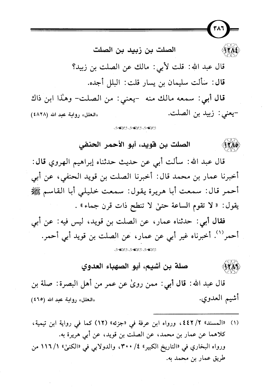 قال عبد اللَّه: سألت أبي عن حديث حدثناه إبراهيم الهروي قال: أخبرنا عمار بن محمد قال: أخبرنا الصلت بن قويد الحنفي، عن أبي أحمر قال: سمعت أبا هريرة يقول: سمعت خليلي أبا القاسم -صلى اللَّه عليه وسلم- يقول: "لا تقوم الساعة حتى لا تنطح ذات قرن جماء".