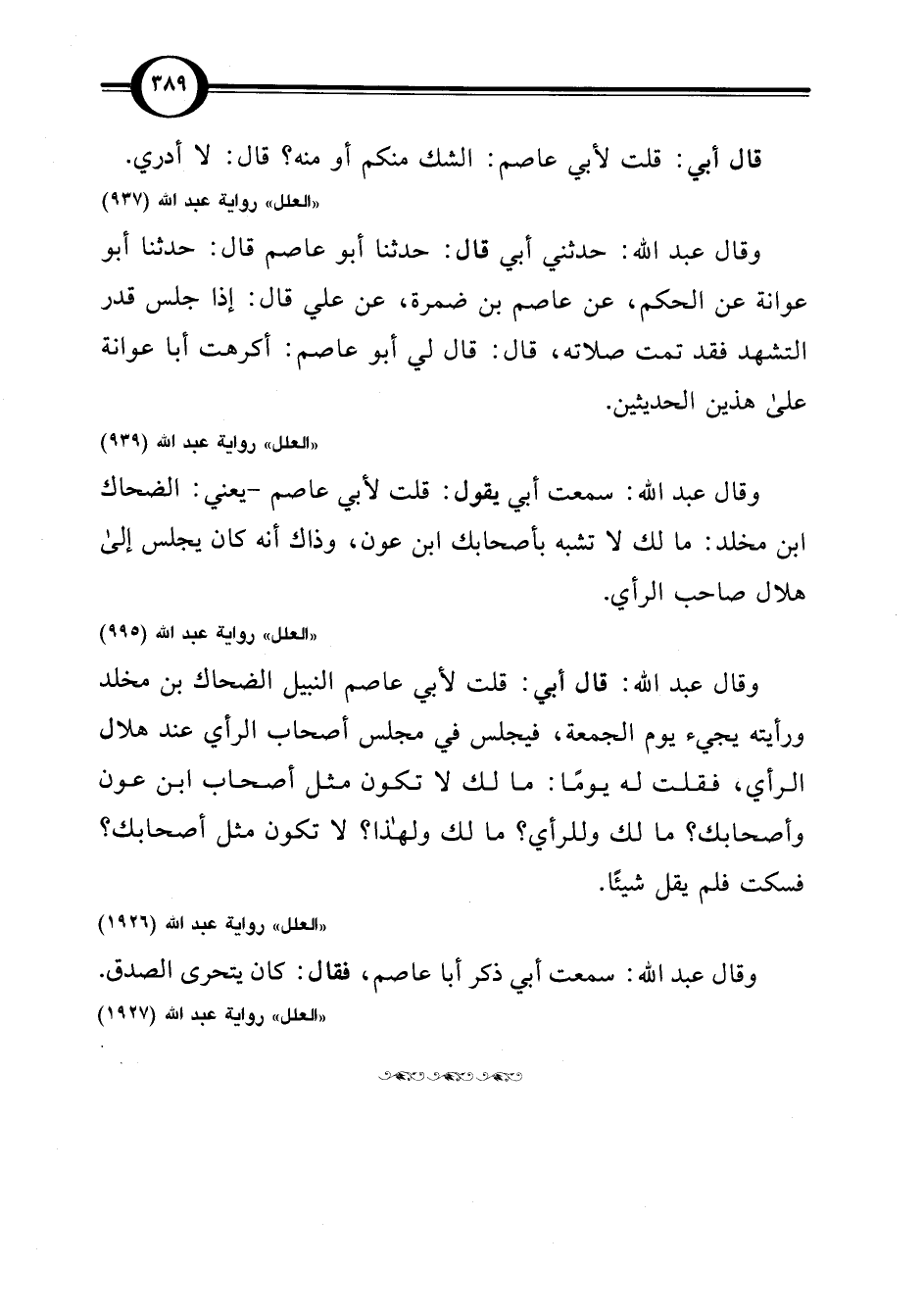 وقال عبد اللَّه: قال أبي: قلت لأبي عاصم النبيل الضحاك بن مخلد ورأيته يجيء يوم الجمعة، فيجلس في مجلس أصحاب الرأي عند هلال الرأي، فقلت له يومًا: ما لك لا تكون مثل أصحاب ابن عون وأصحابك؟ ما لك وللرأي؟ ما لك ولهذا؟ لا تكون مثل أصحابك؟ فسكت فلم يقل شيئًا.