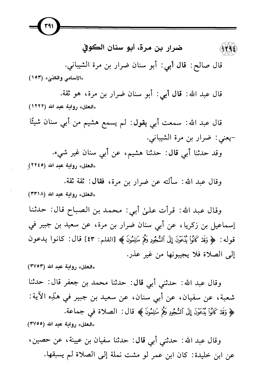 وقال عبد اللَّه: قرأت على أبي: محمد بن الصباح قال: حدثنا إسماعيل بن زكريا، عن أبي سنان ضرار بن مرة، عن سعيد بن جبير في قوله: {وَقَدْ كَانُوا يُدْعَوْنَ إِلَى السُّجُودِ وَهُمْ سَالِمُونَ} [القلم: 43] قال: كانوا يدعون إلى الصلاة فلا يجيبونها من غير عذر.