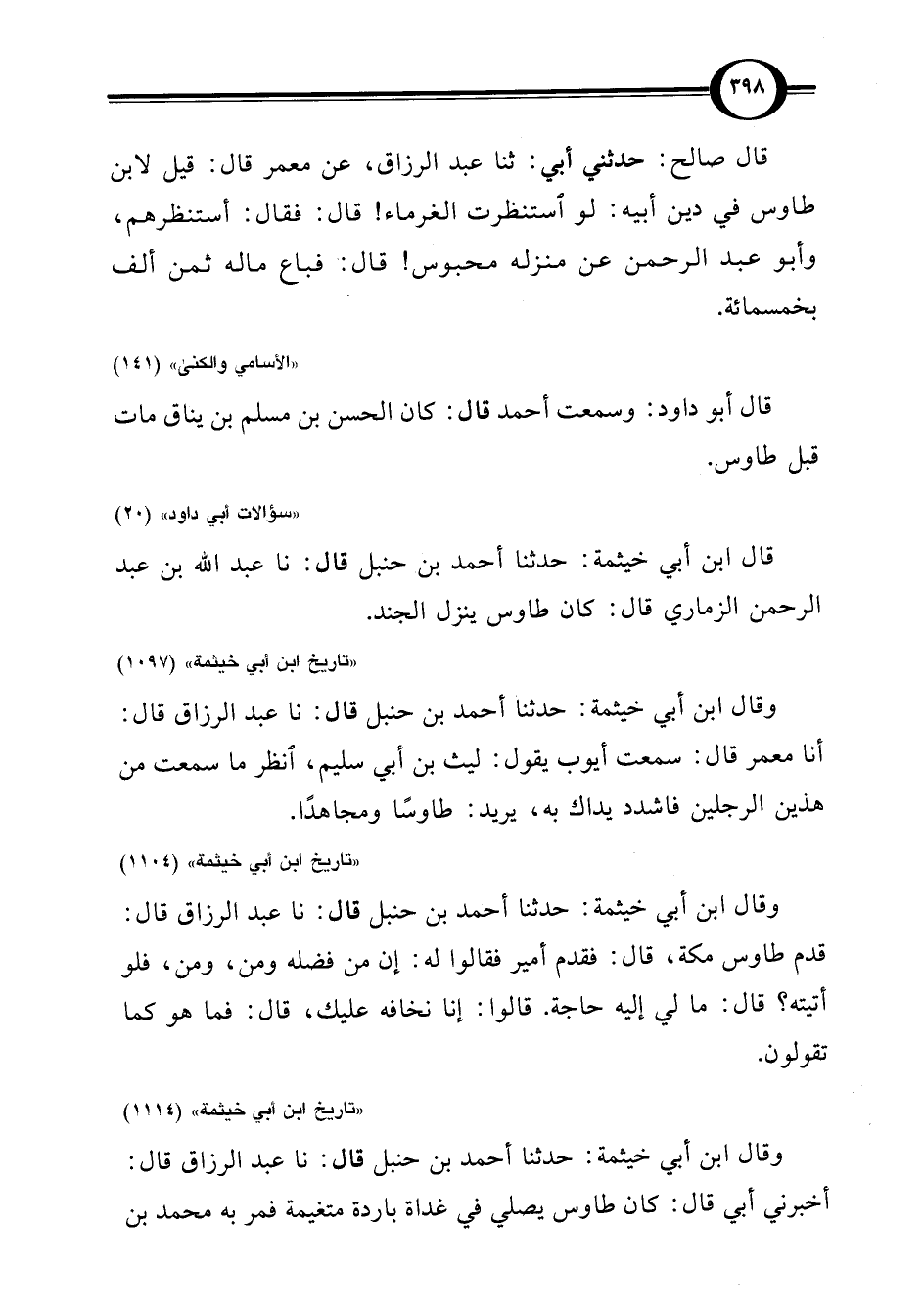 قال صالح: حدثني أبي: ثنا عبد الرزاق، عن معمر قال: قيل لابن طاوس في دين أبيه: لو استنظرت الغرماء! قال: فقال: أستنظرهم، وأبو عبد الرحمن عن منزله محبوس! قال: فباع ماله ثمن ألف بخمسمائة.