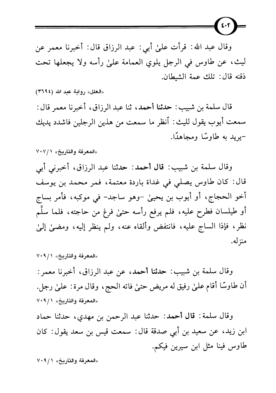 وقال عبد اللَّه: قرأت على أبي: عبد الرزاق قال: أخبرنا معمر عن ليث، عن طاوس في الرجل يلوي العمامة على رأسه ولا يجعلها تحت ذقنه قال: تلك عمة الشيطان.