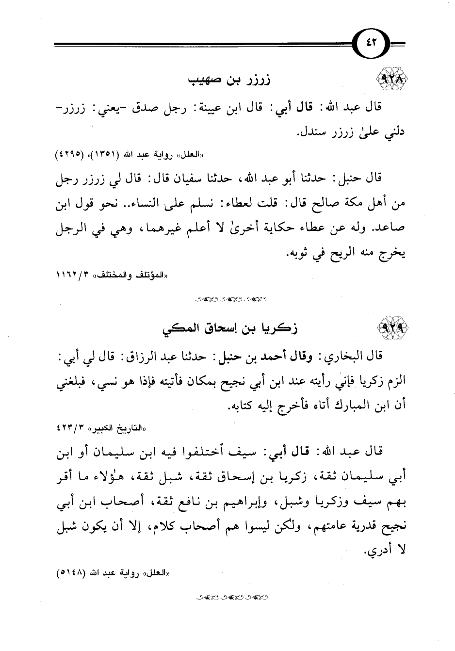 قال عبد اللَّه: قال أبي: سيف اختلفوا فيه ابن سليمان أو ابن أبي سليمان ثقة، زكريا بن إسحاق ثقة، شبل ثقة، هؤلاء ما أقر بهم سيف وزكريا وشبل، وإبراهيم بن نافع ثقة، أصحاب ابن أبي نجيح قدرية عامتهم، ولكن ليسوا هم أصحاب كلام، إلا أن يكون شبل لا أدري.