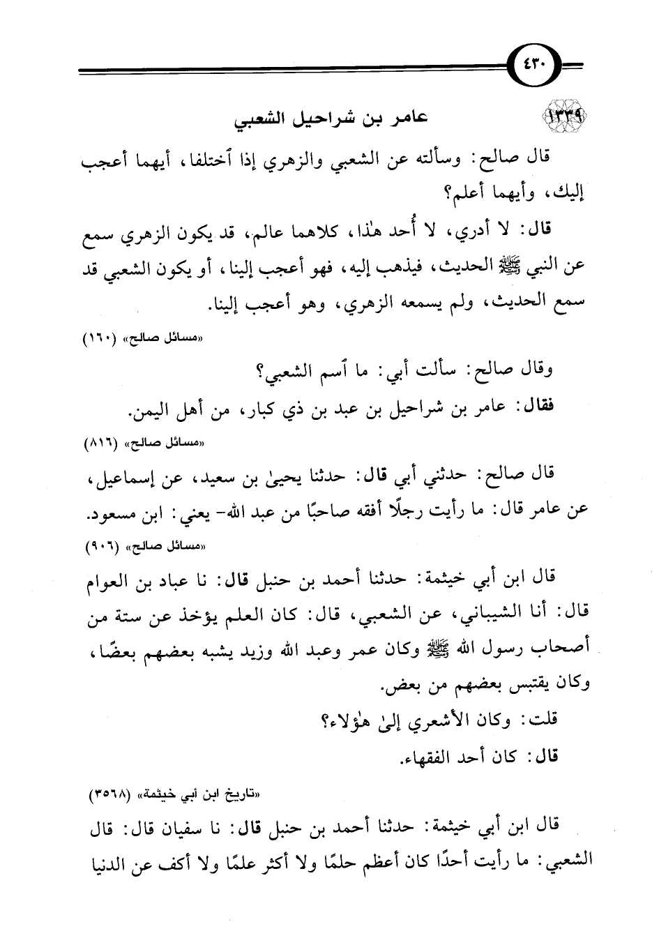 قال ابن أبي خيثمة: حدثنا أحمد بن حنبل قال: نا سفيان قال: قال الشعبي: ما رأيت أحدًا كان أعظم حلمًا ولا أكثر علمًا ولا أكف عن الدنيا