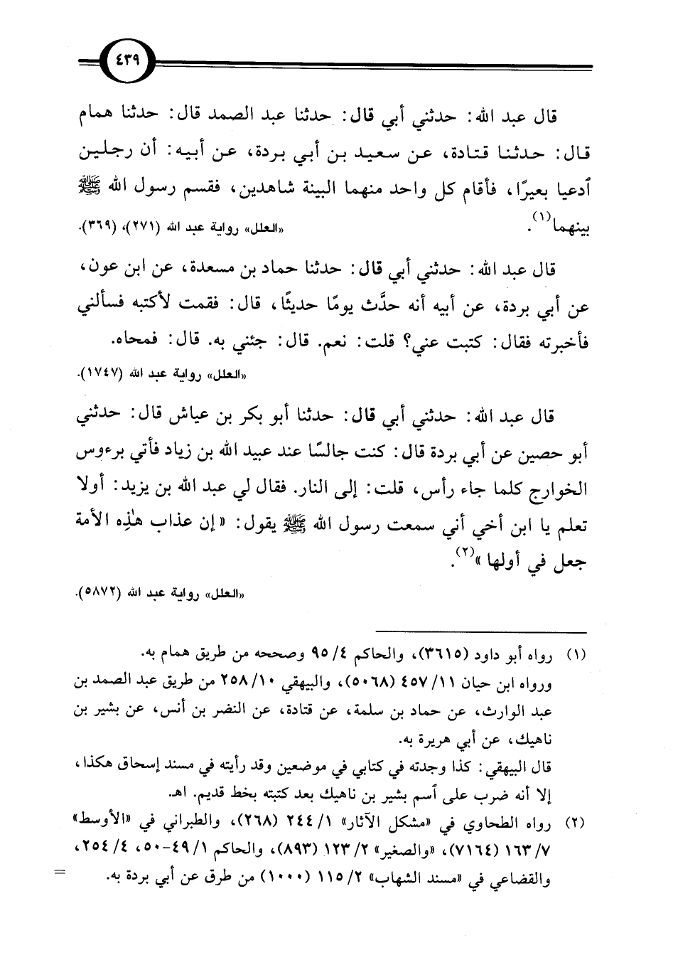 قال عبد اللَّه: حدثني أبي قال: حدثنا أبو بكر بن عياش قال: حدثني أبو حصين عن أبي بردة قال: كنت جالسًا عند عبيد اللَّه بن زياد فأتي برءوس الخوارج كلما جاء رأس، قلت: إلى النار. فقال لي عبد اللَّه بن يزيد: أولا تعلم يا ابن أخي أني سمعت رسول اللَّه -صلى اللَّه عليه وسلم- يقول: "إن عذاب هذِه الأمة جعل في أولها" (¬2).