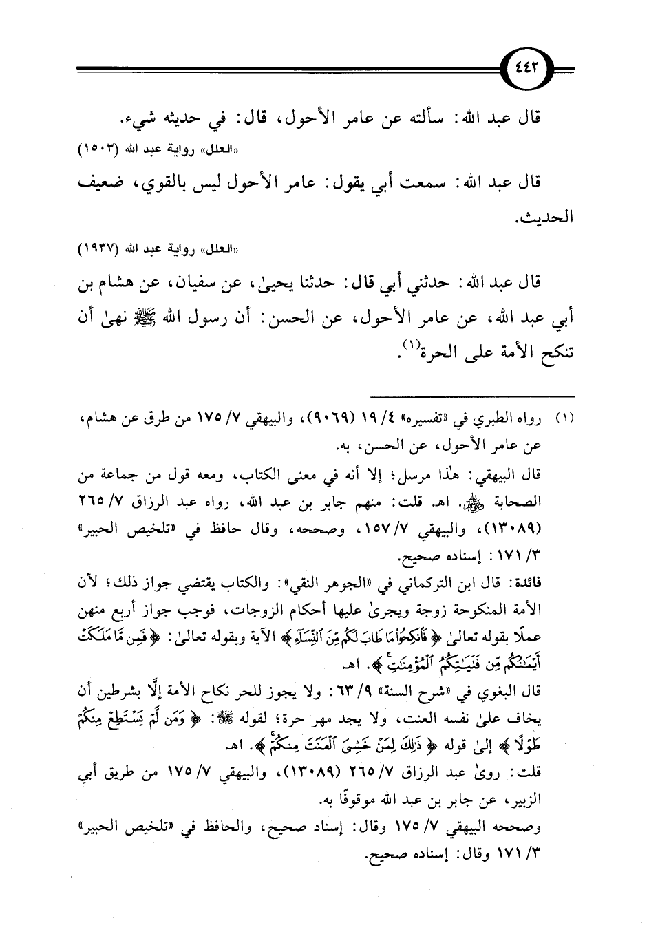 قال عبد اللَّه: حدثني أبي قال: حدثنا يحيى، عن سفيان، عن هشام بن أبي عبد اللَّه، عن عامر الأحول، عن الحسن: أن رسول اللَّه -صلى اللَّه عليه وسلم- نهى أن تنكح الأمة على الحرة (¬1).