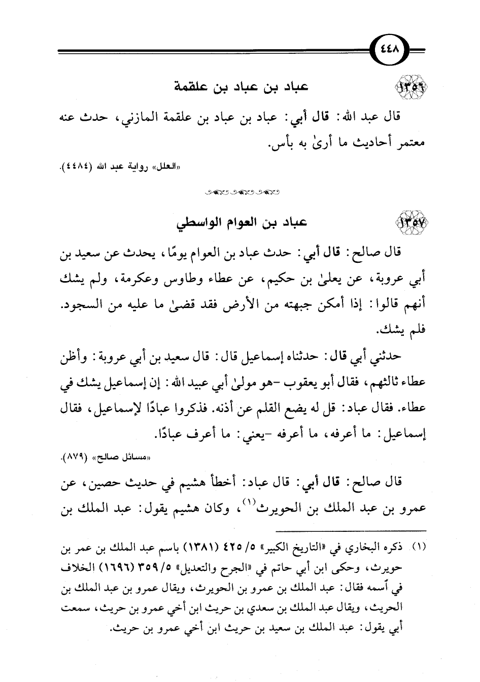 قال صالح: قال أبي: قال عباد: أخطأ هشيم في حديث حصين، عن عمرو بن عبد الملك بن الحويرث (¬1)، وكان هشيم يقول: عبد الملك بن