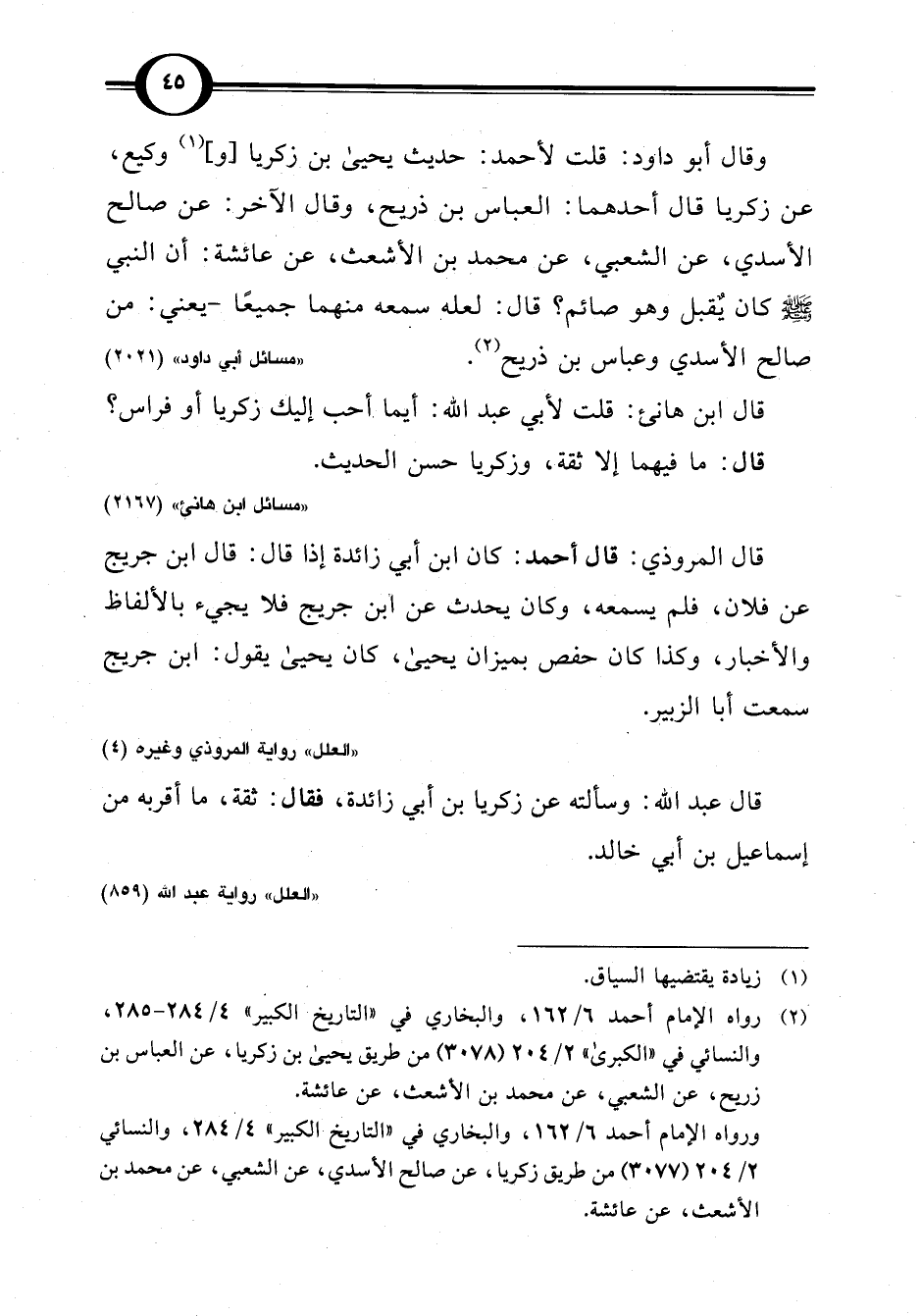قال ابن هانئ: قلت لأبي عبد اللَّه: أيما. أحب إليك زكريا أو فراس؟ قال: ما فيهما إلا ثقة، وزكريا حسن الحديث.