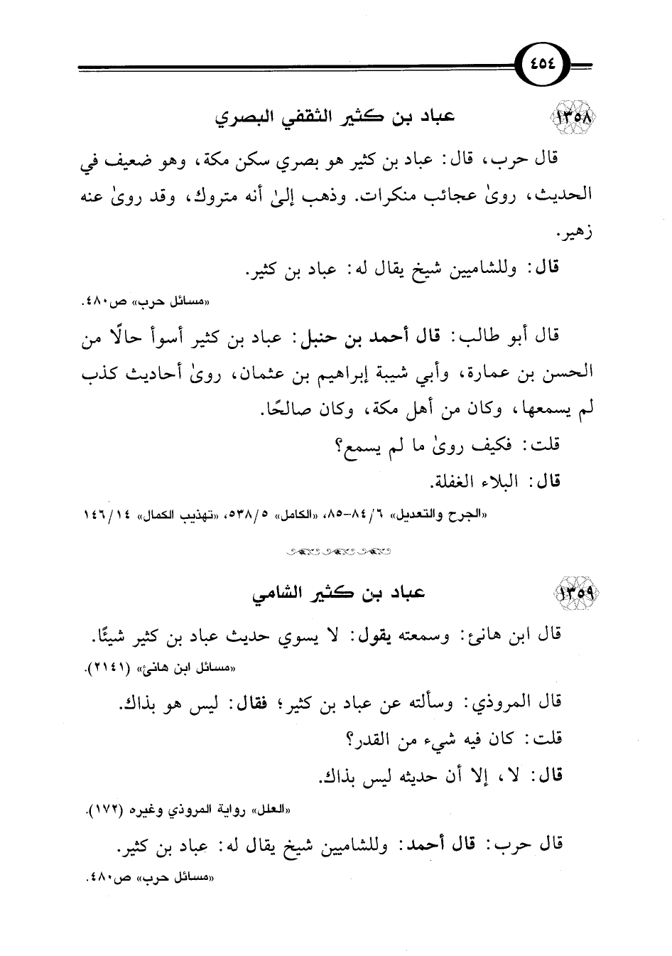 قال حرب: قال أحمد: وللشاميين شيخ يقال له: عباد بن كثير.
