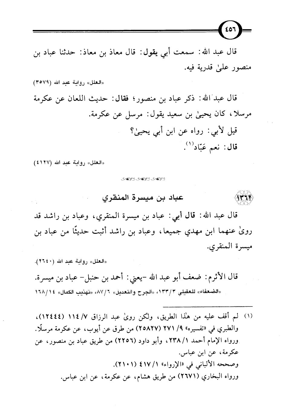 قال عبد اللَّه: ذكر عباد بن منصور؛ فقال: حديث اللعان عن عكرمة مرسلا، كان يحيى بن سعيد يقول: مرسل عن عكرمة.