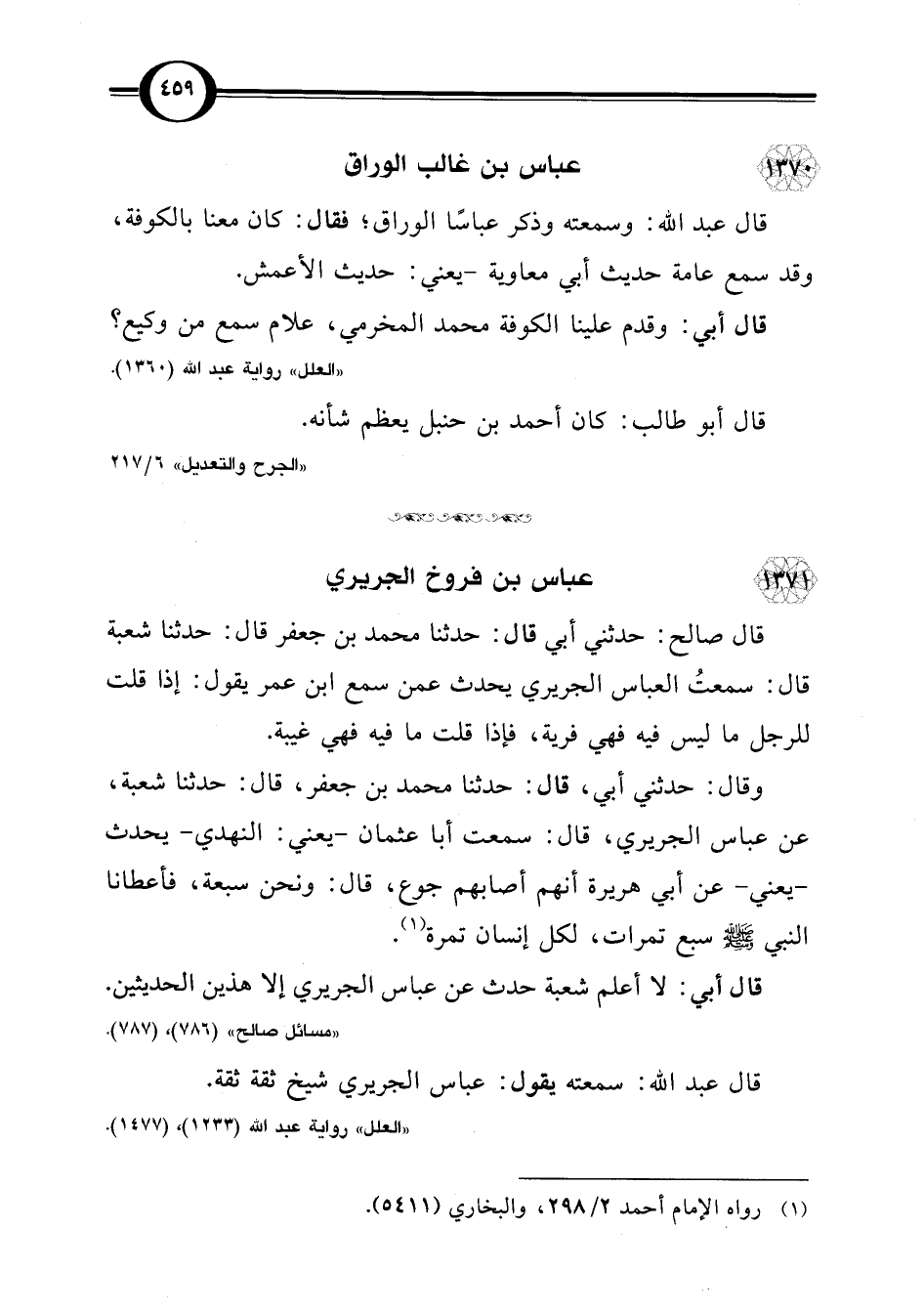 قال عبد اللَّه: وسمعته وذكر عباسًا الوراق؛ فقال: كان معنا بالكوفة، وقد سمع عامة حديث أبي معاوية -يعني: حديث الأعمش.