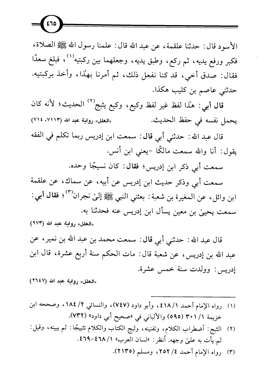 قال عبد اللَّه: حدثني أبي قال: سمعت ابن إدريس ربما تكلم في الفقه يقول: أنا واللَّه سمعت مالكًا -يعني ابن أنس.