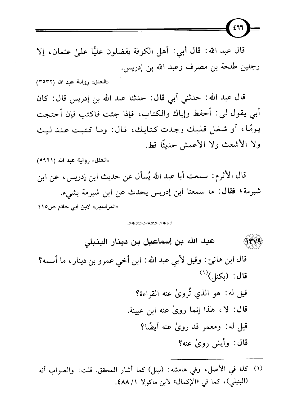 قال عبد اللَّه: قال أبي: أهل الكوفة يفضلون عليًّا على عثمان، إلا رجلين طلحة بن مصرف وعبد اللَّه بن إدريس.