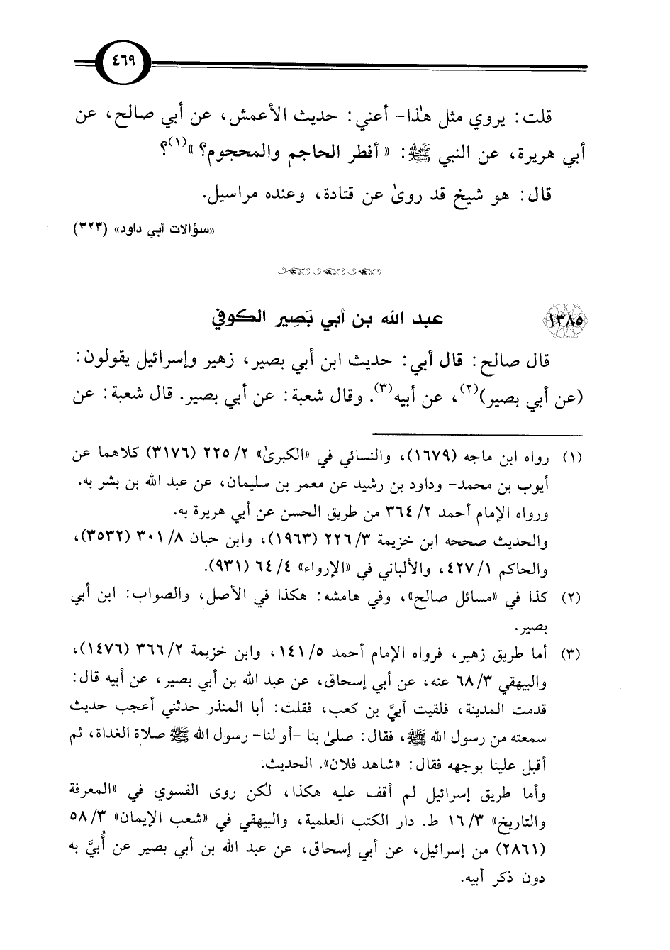 (¬2) كذا في "مسائل صالح"، وفي هامشه: هكذا في الأصل، والصواب: ابن أبي بصير.