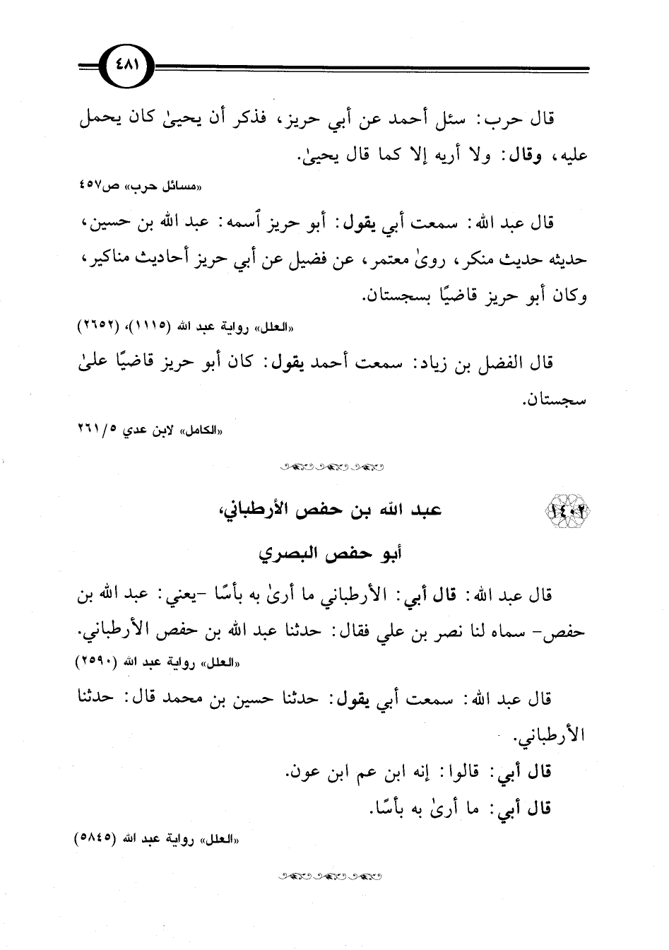 قال عبد اللَّه: قال أبي: الأرطباني ما أرى به بأسًا -يعني: عبد اللَّه بن حفص- سماه لنا نصر بن علي فقال: حدثنا عبد اللَّه بن حفص الأرطباني.