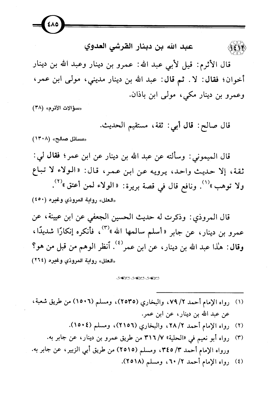 قال الأثرم: قيل لأبي عبد اللَّه: عمرو بن دينار وعبد اللَّه بن دينار أخوان؛ فقال: لا. ثم قال: عبد اللَّه بن دينار مديني، مولى ابن عمر، وعمرو بن دينار مكي، مولى ابن باذان.