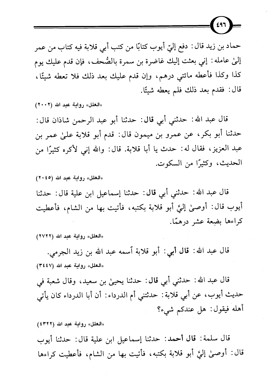قال سلمة: قال أحمد: حدثنا إسماعيل ابن علية قال: حدثنا أيوب قال: أوصى إليَّ أبو قلابة بكتبه، فأتيت بها من الشام، فأعطيت كراءها