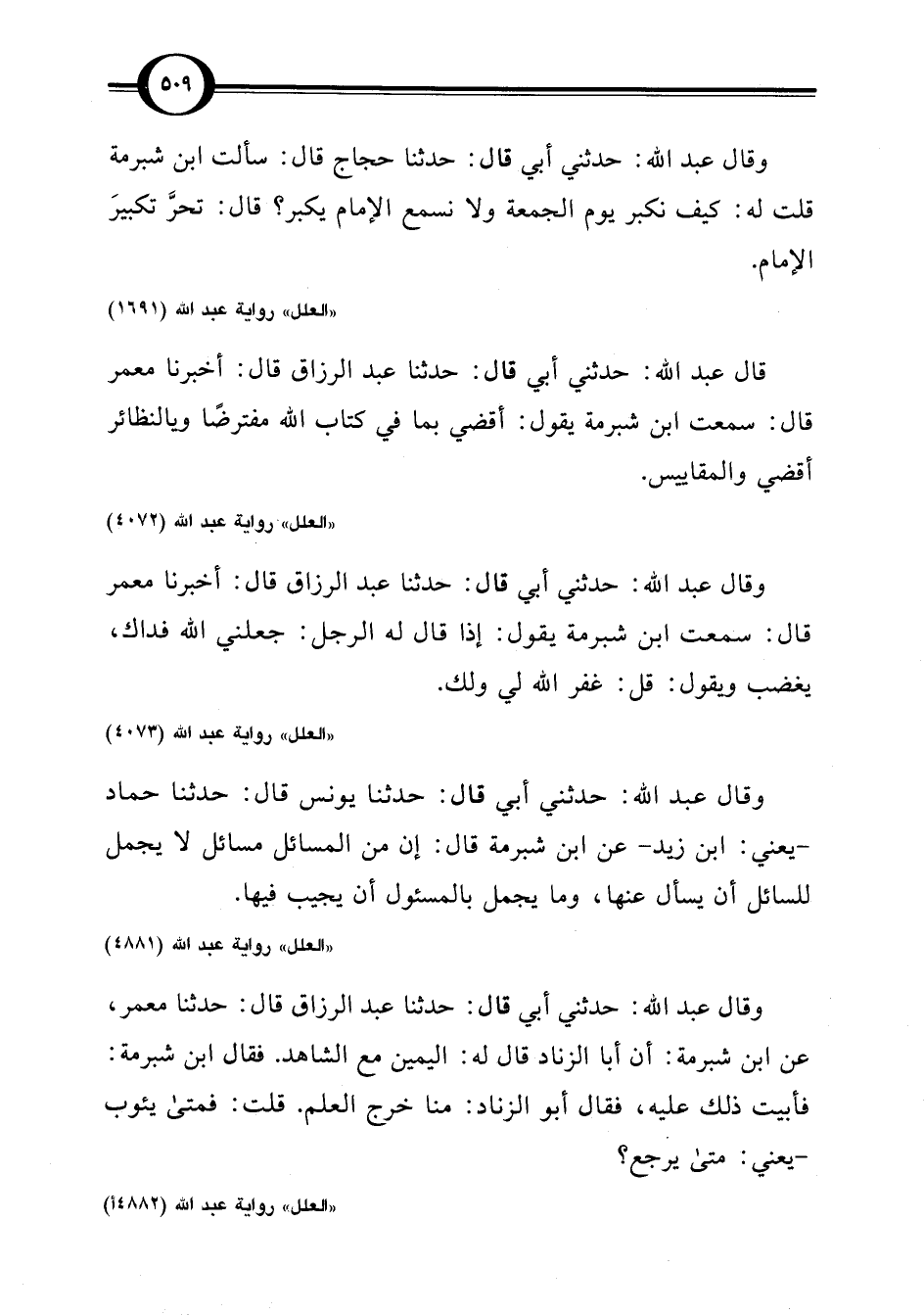 وقال عبد اللَّه: حدثني أبي قال: حدثنا عبد الرزاق قال: حدثنا معمر، عن ابن شبرمة: أن أبا الزناد قال له: اليمين مع الشاهد. فقال ابن شبرمة: فأبيت ذلك عليه، فقال أبو الزناد: منا خرج العلم. قلت: فمتى يئوب -يعني: متى يرجع؟