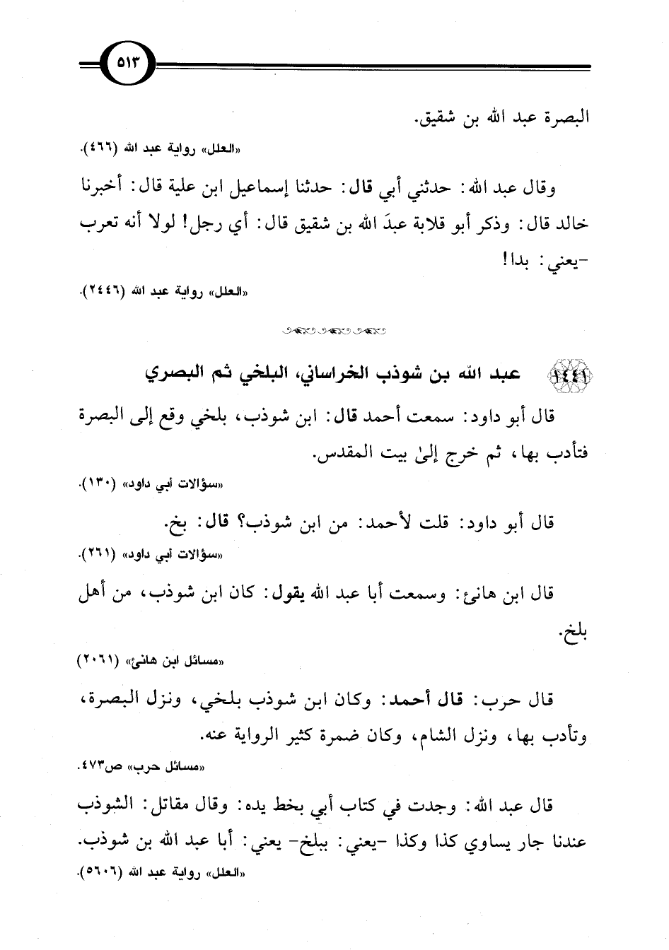 قال عبد اللَّه: وجدت في كتاب أبي بخط يده: وقال مقاتل: الشوذب عندنا جار يساوي كذا وكذا -يعني: ببلخ- يعني: أبا عبد اللَّه بن شوذب.