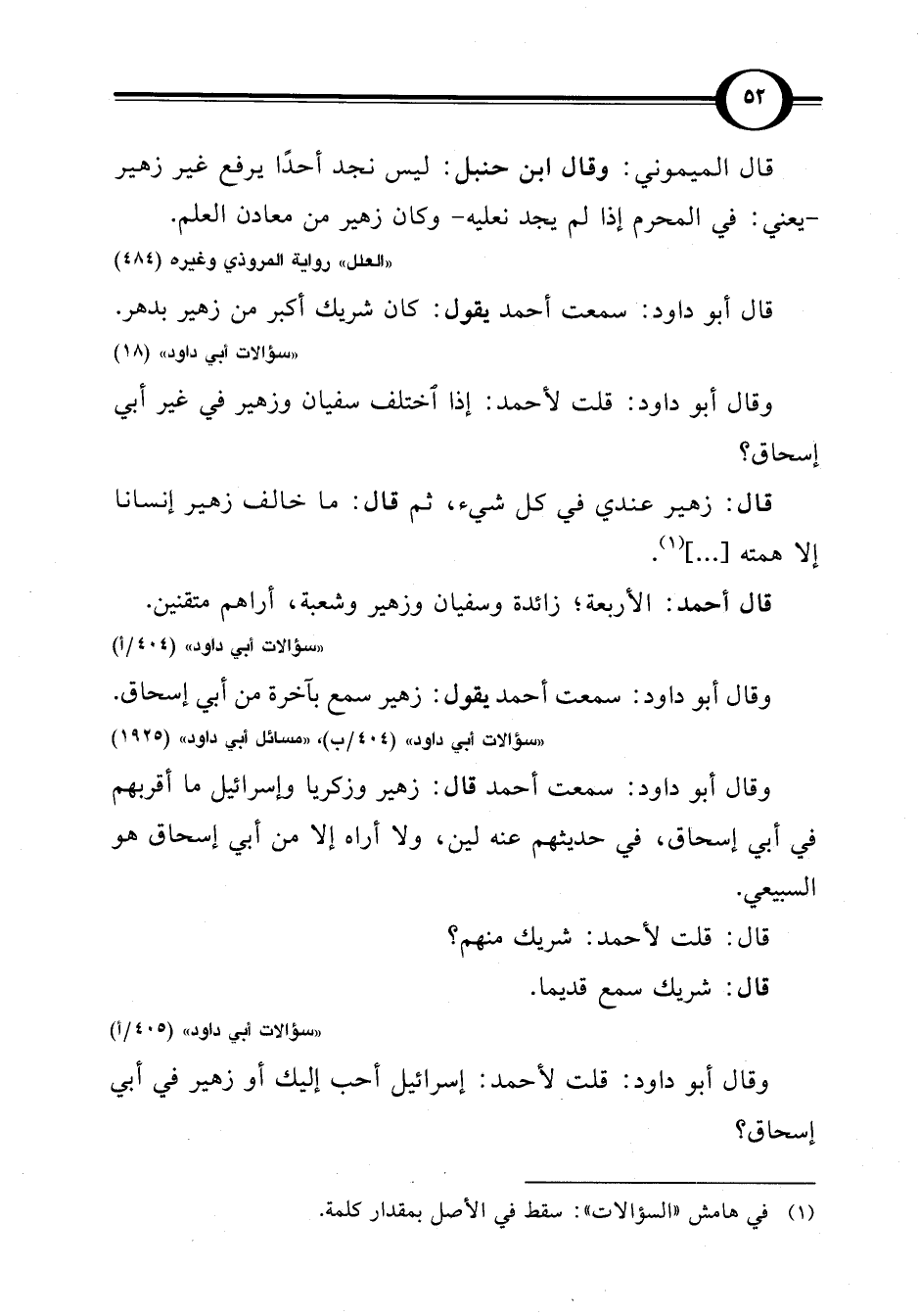 قال الميموني: وقال ابن حنبل: ليس نجد أحدًا يرفع غير زهير -يعني: في المحرم إذا لم يجد نعليه- وكان زهير من معادن العلم.