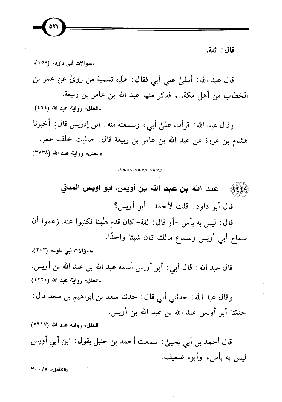 وقال عبد اللَّه: حدثني أبي قال: حدثنا سعد بن إبراهيم بن سعد قال: حدثنا أبو أويس عبد اللَّه بن عبد اللَّه بن أويس.