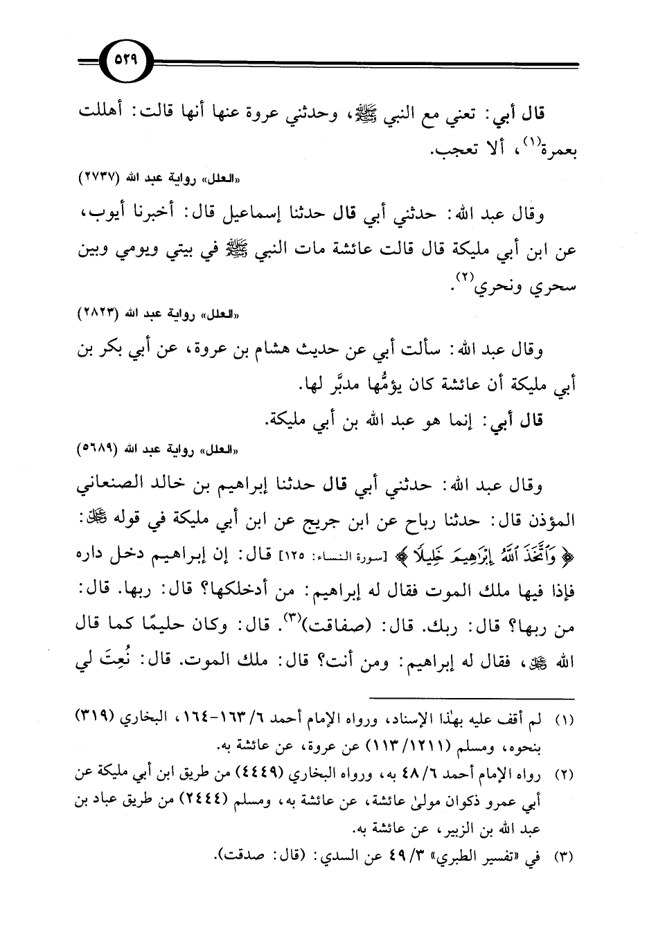 وقال عبد اللَّه: سألت أبي عن حديث هشام بن عروة، عن أبي بكر بن أبي مليكة أن عائشة كان يؤمُّها مدبَّر لها.