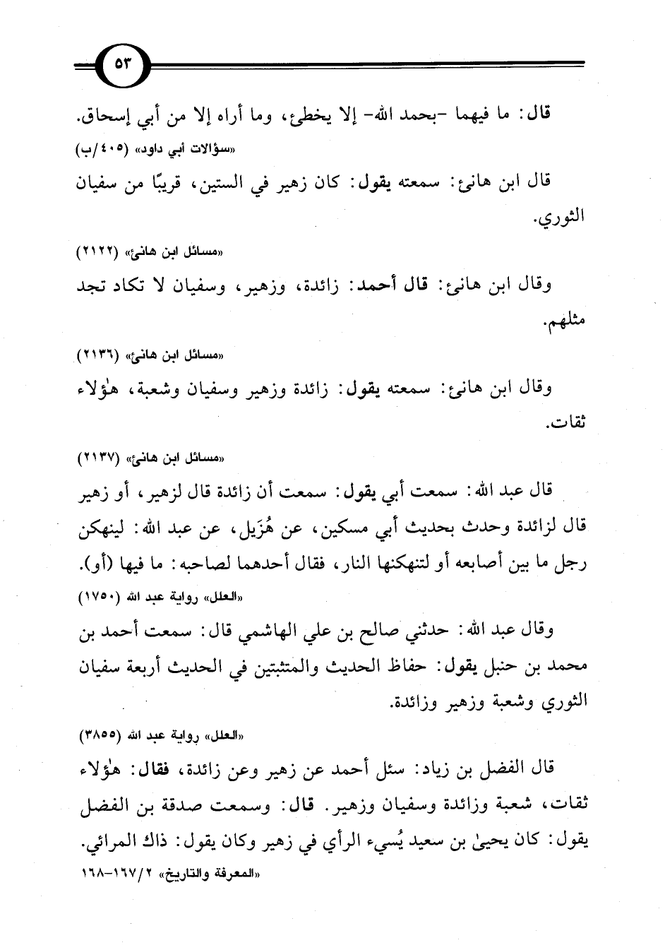 وقال عبد اللَّه: حدثني صالح بن علي الهاشمي قال: سمعت أحمد بن محمد بن حنبل يقول: حفاظ الحديث والمتثبتين في الحديث أربعة سفيان الثوري وشعبة وزهير وزائدة.