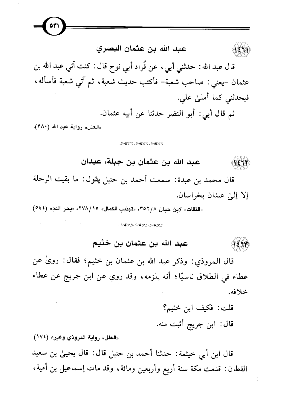 قال عبد اللَّه: حدثني أبي، عن قُراد أبي نوح قال: كنت آتي عبد اللَّه بن عثمان -يعني: صاحب شعبة- فأكتب حديث شعبة، ثم آتي شعبة فأسأله، فيحدثني كما أملى علي.