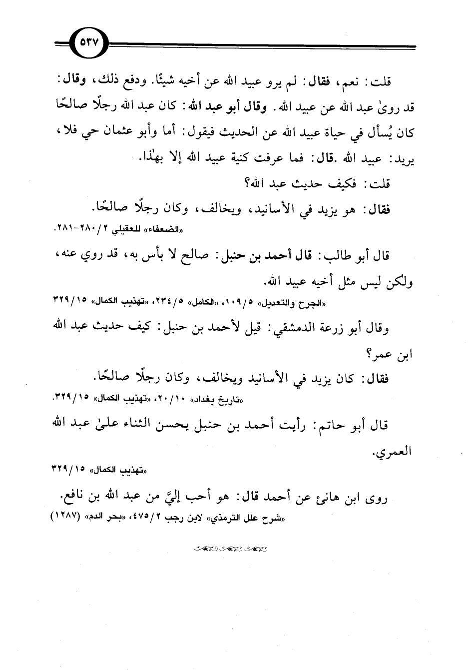 قال أبو حاتم: رأيت أحمد بن حنبل يحسن الثناء على عبد اللَّه العمري.
