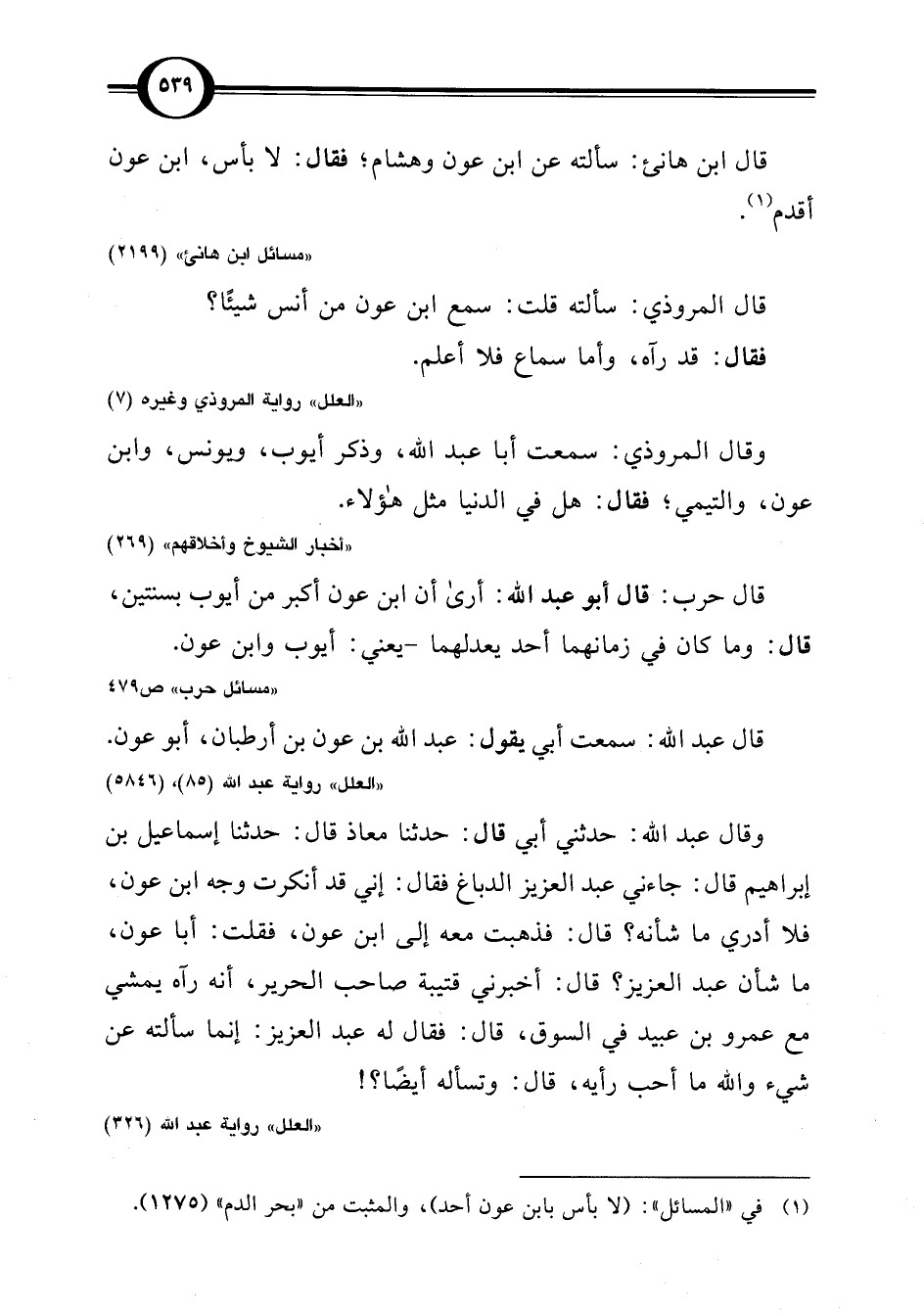 (¬1) في "المسائل": (لا بأس بابن عون أحد)، والمثبت من "بحر الدم" (1275).