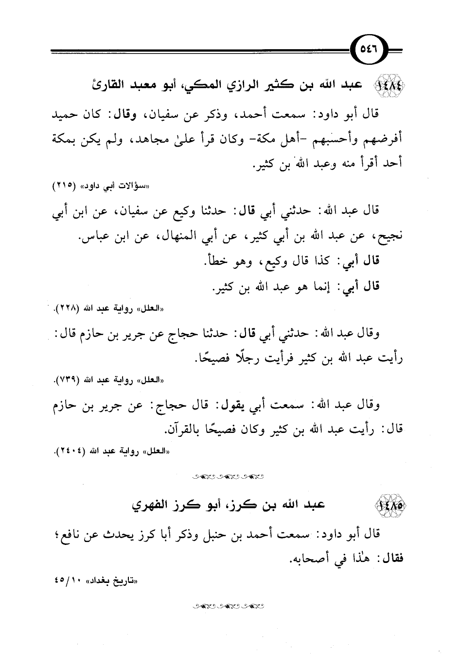 وقال عبد اللَّه: سمعت أبي يقول: قال حجاج: عن جرير بن حازم قال: رأيت عبد اللَّه بن كثير وكان فصيحًا بالقرآن.