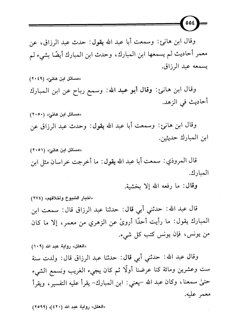 وقال ابن هانئ: وسمعت أبا عبد اللَّه يقول: وحدث عبد الرزاق عن ابن المبارك حديثين.