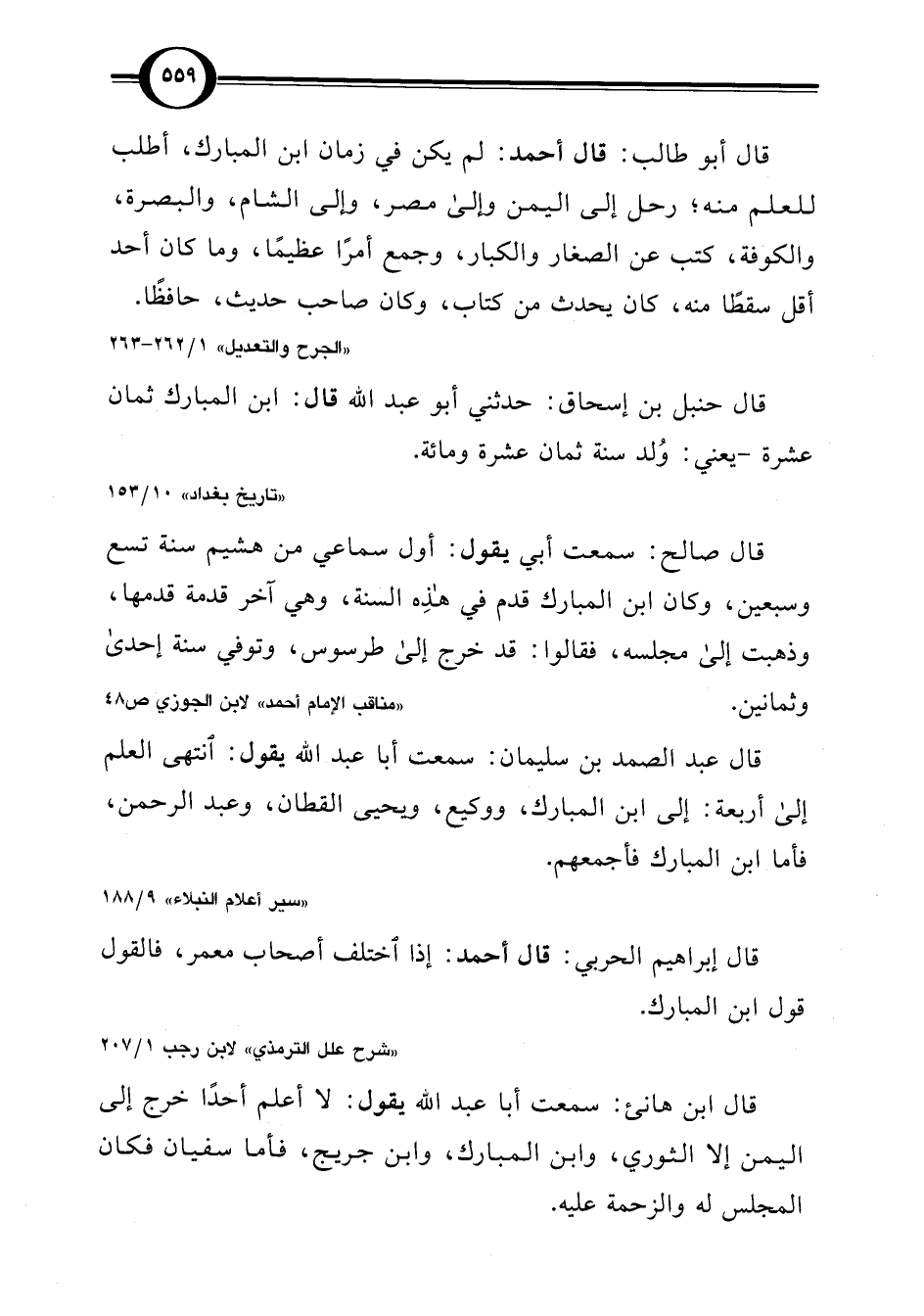 قال عبد الصمد بن سليمان: سمعت أبا عبد اللَّه يقول: انتهى العلم إلى أربعة: إلى ابن المبارك، ووكيع، ويحيى القطان، وعبد الرحمن، فأما ابن المبارك فأجمعهم.