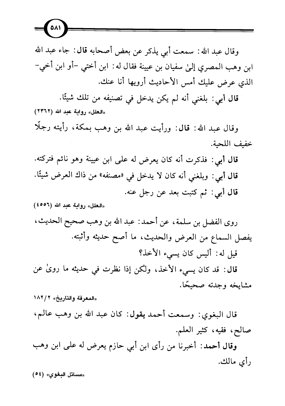 وقال عبد اللَّه: سمعت أبي يذكر عن بعض أصحابه قال: جاء عبد اللَّه ابن وهب المصري إلى سفيان بن عيينة فقال له: ابن أختي -أو ابن أخي- الذي عرض عليك أمس الأحاديث أرويها أنا عنك.