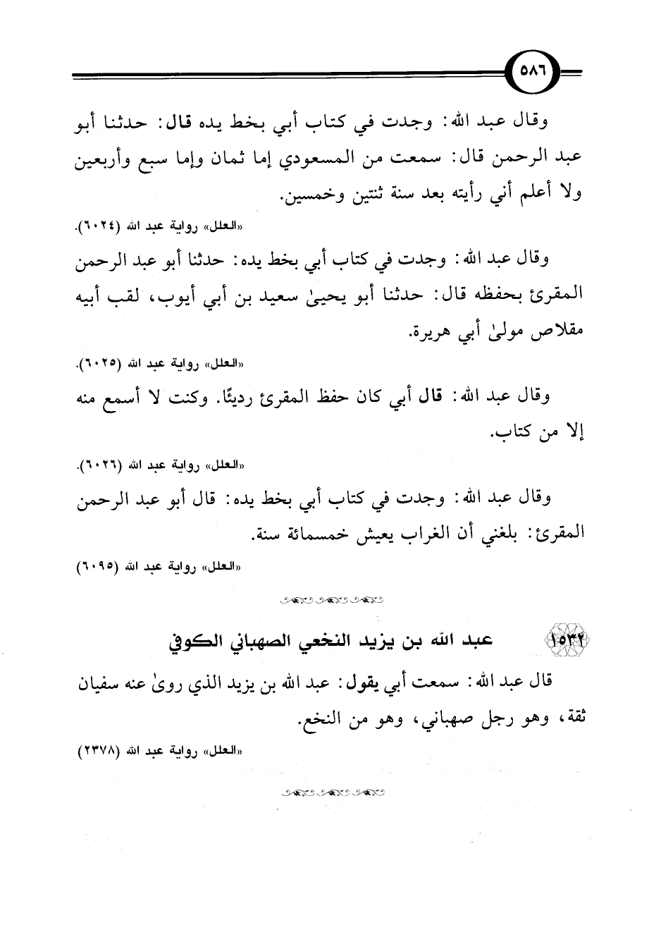قال عبد اللَّه: سمعت أبي يقول: عبد اللَّه بن يزيد الذي روى عنه سفيان ثقة، وهو رجل صهباني، وهو من النخع.