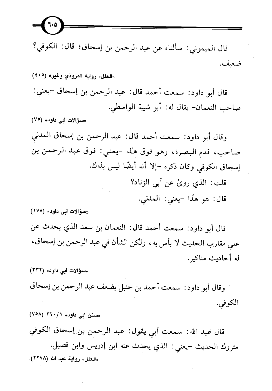وقال أبو داود: سمعت أحمد بن حنبل يضعف عبد الرحمن بن إسحاق الكوفي.
