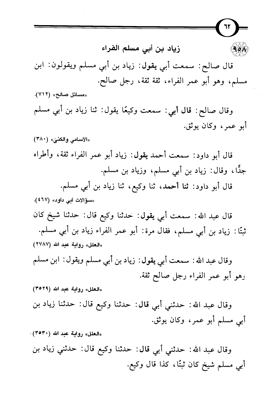 قال عبد اللَّه: سمعت أبي يقول: حدثنا وكيع قال: حدثنا شيخ كان ثبتًا: زياد بن أبي مسلم، فقال مرة: أبو عمر الفراء زياد بن أبي مسلم.
