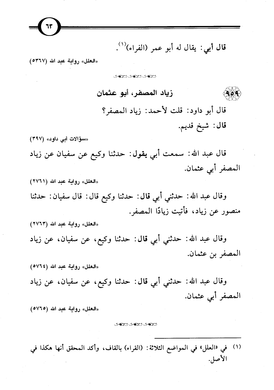 قال عبد اللَّه: سمعت أبي يقول: حدثنا وكيع عن سفيان عن زياد المصفر أبي عثمان.