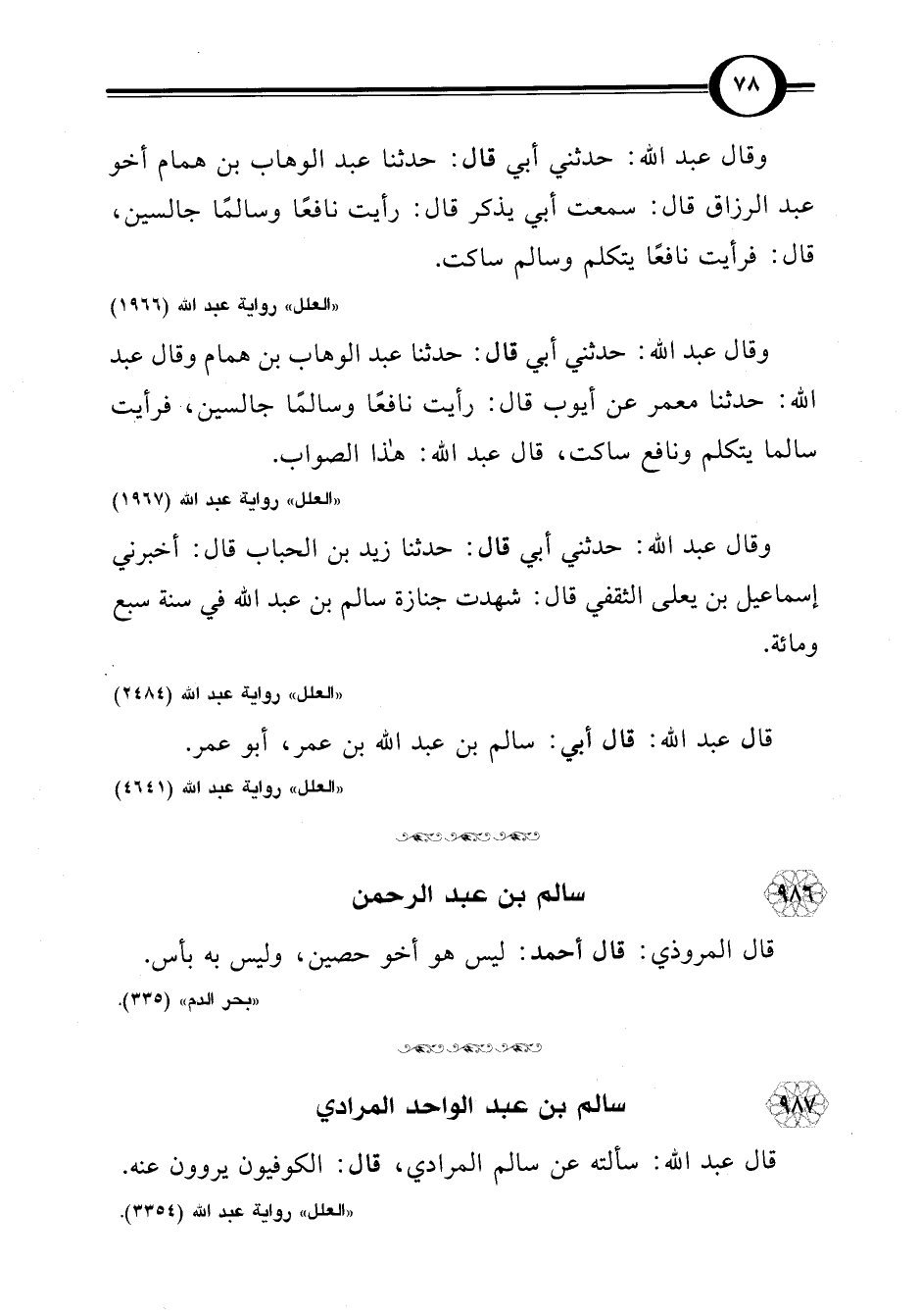 وقال عبد اللَّه: حدثني أبي قال: حدثنا عبد الوهاب بن همام وقال عبد اللَّه: حدثنا معمر عن أيوب قال: رأيت نافعًا وسالمًا جالسين، فرأيت سالما يتكلم ونافع ساكت، قال عبد اللَّه: هذا الصواب.