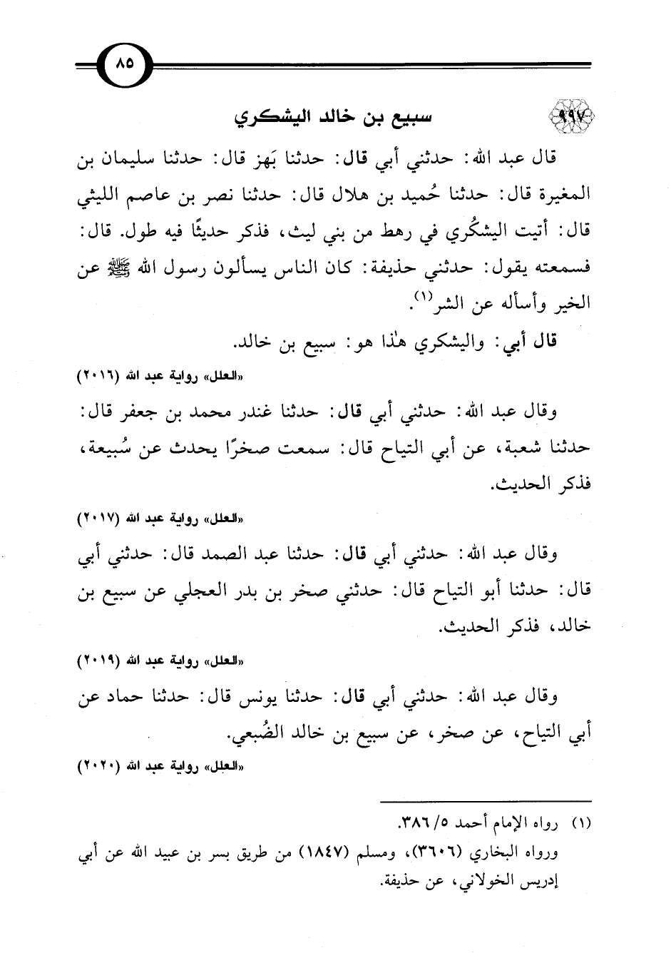 وقال عبد اللَّه: حدثني أبي قال: حدثنا يونس قال: حدثنا حماد عن أبي التياح، عن صخر، عن سبيع بن خالد الضُبعي.