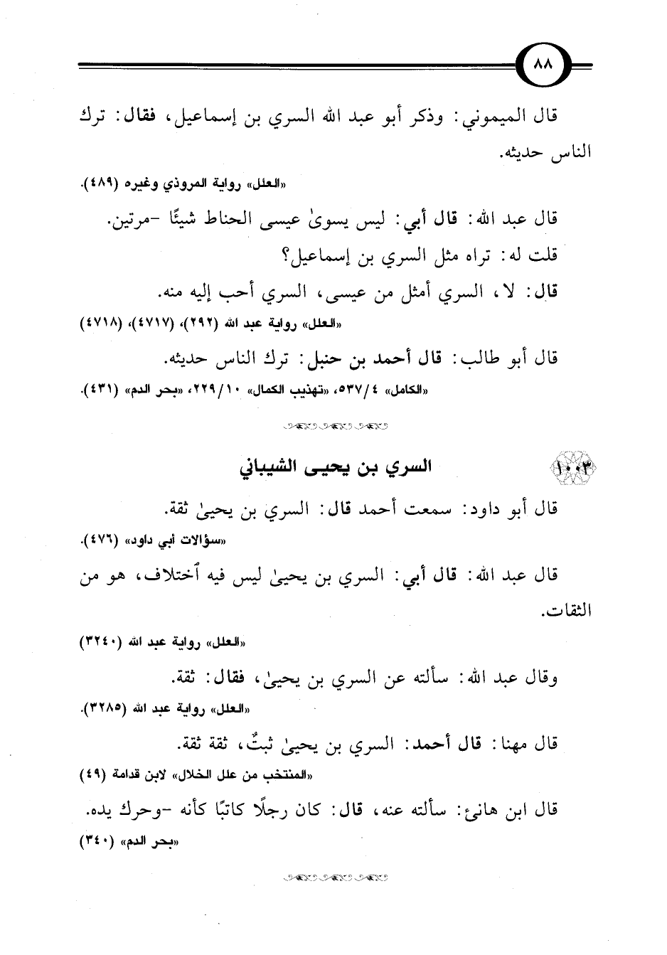 قال مهنا: قال أحمد: السري بن يحيى ثبتٌ، ثقة ثقة.