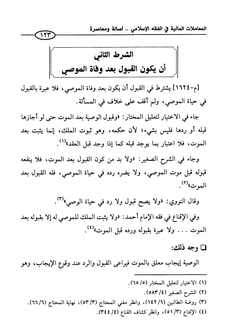 وفي الإقناع في فقه الإِمام أحمد: "ولا يثبت الملك للموصي له إلا بقبوله بعد الموت ... ولا عبرة بقبوله ورده قبل الموت" (¬٤).