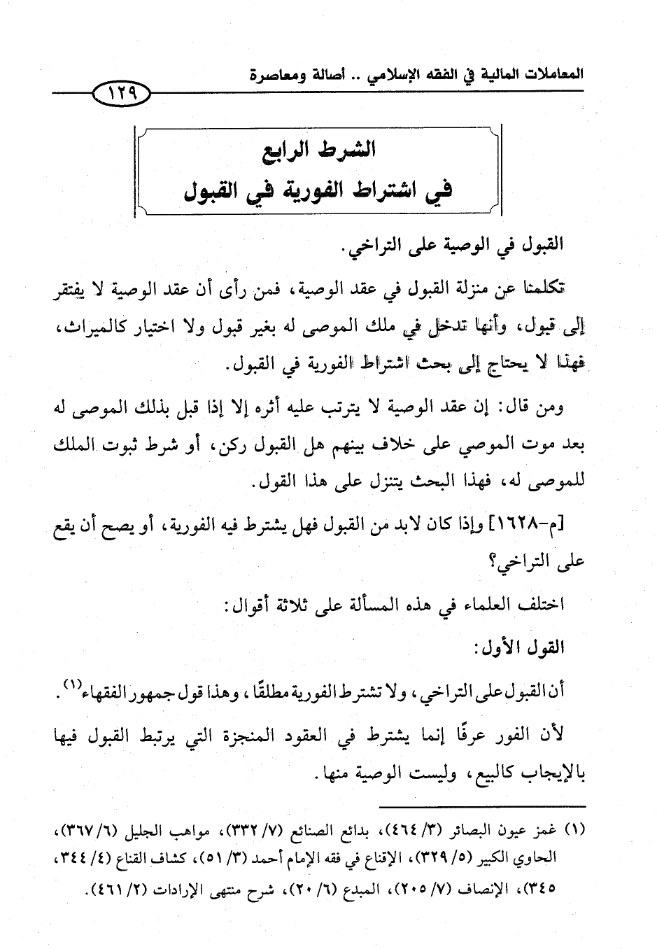 تكلمنا عن منزلة القبول في عقد الوصية، فإن رأى أن عقد الوصية لا يفتقر إلى قبول، وأنها تدخل في ملك الموصى له بغير قبول ولا اختيار كالميراث، فهذا لا يحتاج إلي بحث اشتراط بالفورية في القبول.